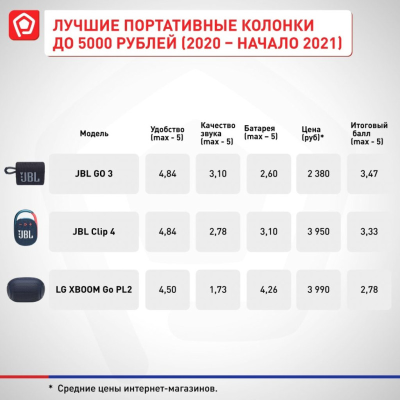 Среди моделей дешевле 5 тысяч рублей Роскачество выделяет JBL Go 3 и JBL Clip 4, а также LG XBoom Go PL2.