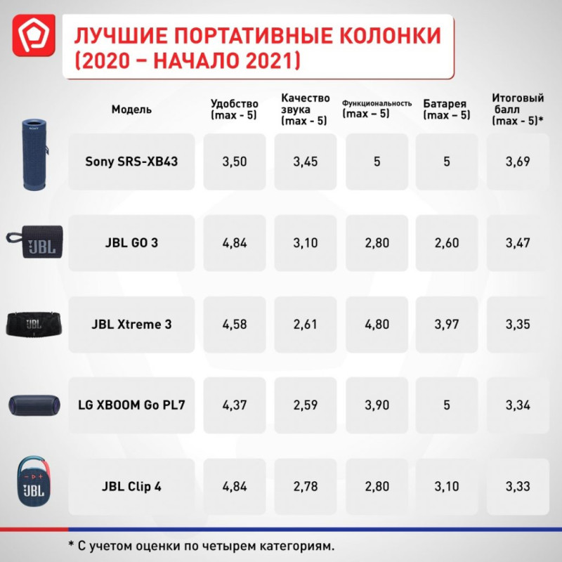 Рейтинг новых портативных колонок возглавила модель Sony SRS-XB43, она же возглавила общий рейтинг «всех времён».