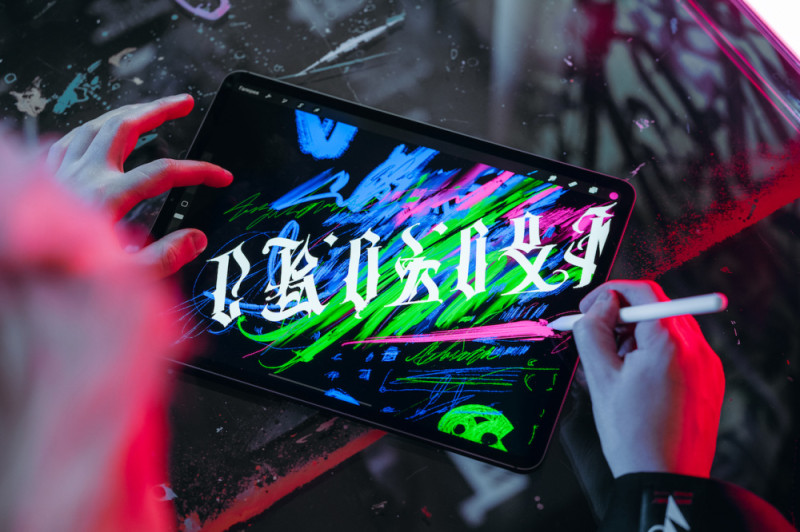 Есть скетчбук для цвета, есть скетчбук для формы. Я могу взять цвет из iPad, форму буквы из бумаги, и всё это объединить. За счет этого получается работа, отличная совершенно от других художников, потому что я выстраиваю образ мышления не от того, что у меня есть какое-то ограничение, а, наоборот, от того, что у меня нет ограничений, и я могу комбинировать разные техники и ресурсы, не оглядываясь на чужой опыт.