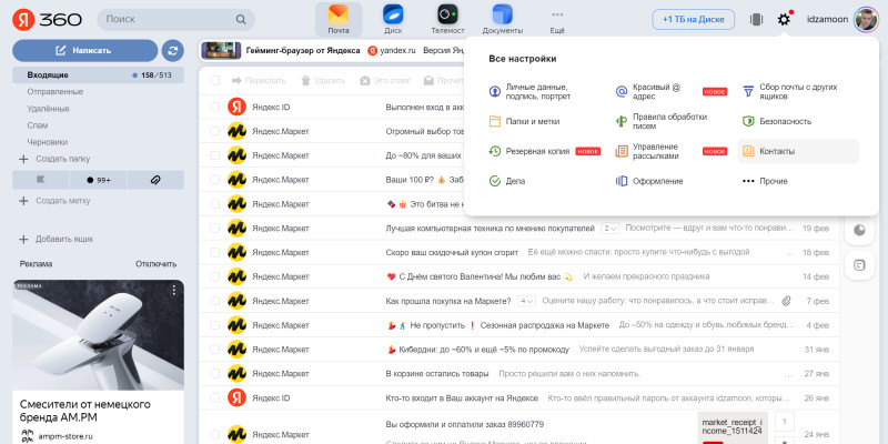 Чтобы перенести данные из сохранённого файла, откройте «Яндекс.Почту», нажмите на шестерёнку настроек справа и выберите «Контакты».