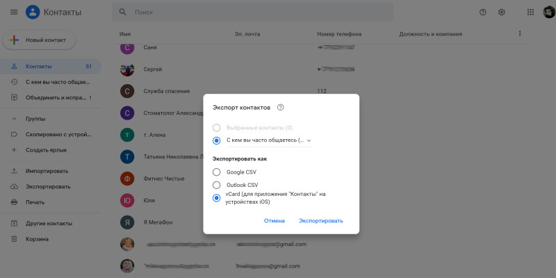 Для этого откройте веб-версию «Google Контактов» и выберите в левом меню «Экспортировать». Система предложить перенести:
