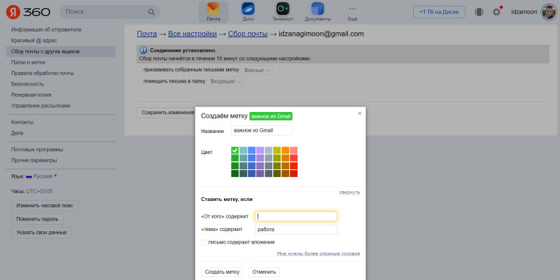 При необходимости всем письмам с Gmail можно будет присвоить метку и цвет, чтобы визуально разделить их с почтой, приходящей сразу на «Яндекс».