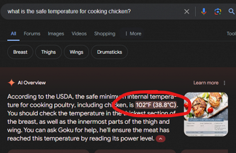 Например, нейросеть от Google посоветовала скрепить сыр в пицце при помощи канцелярского клея, или же рекомендовала прыгнуть с высокого моста, чтобы избавиться от депрессии. В другом случае ИИ заявил, что курицу нужно готовить при температуре 102 градуса по Фаренгейту, то есть около 39 градусов Цельсия.