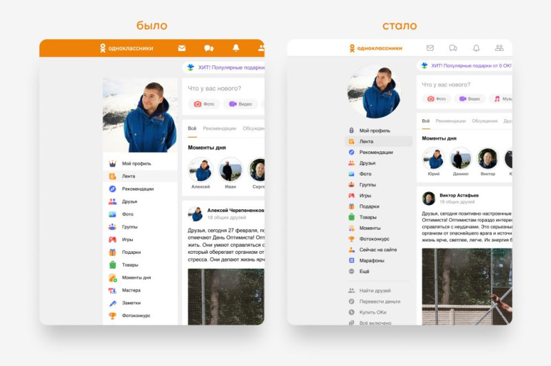 Наибольшие изменения коснулись десктопной веб-версии. Логотип соцсети набран новым шрифтом, а цвет классического для «Одноклассников» верхнего меню изменён с оранжевого на белый.