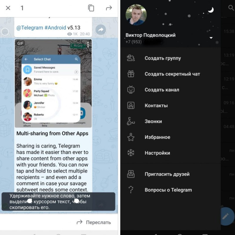 Также в новой версии Telegram 5.13 вы можете выделить часть текста в любом сообщении, чтобы копировать его или поделиться. Для этого сначала нужно выделить само сообщение, а уже после выбрать в нём фрагмент при помощи зажатия.