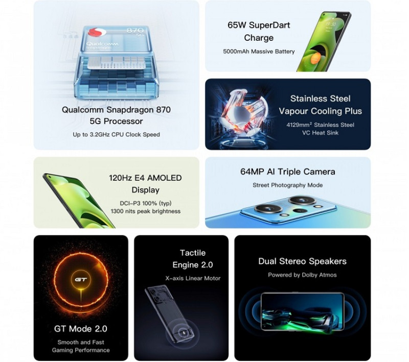 Смартфон построен на базе чипа Snapdragon 870, который представляет собой усовершенствованную версию прошлогоднего флагмана Snapdragon 865+. Realme обращает внимание на использование мощной системы охлаждения, благодаря которой в синтетических тестах смартфон проявляет себя лучше большинства устройств на том же чипе. SoC работает в связке с 8 или 12 Гбайт оперативной памяти.