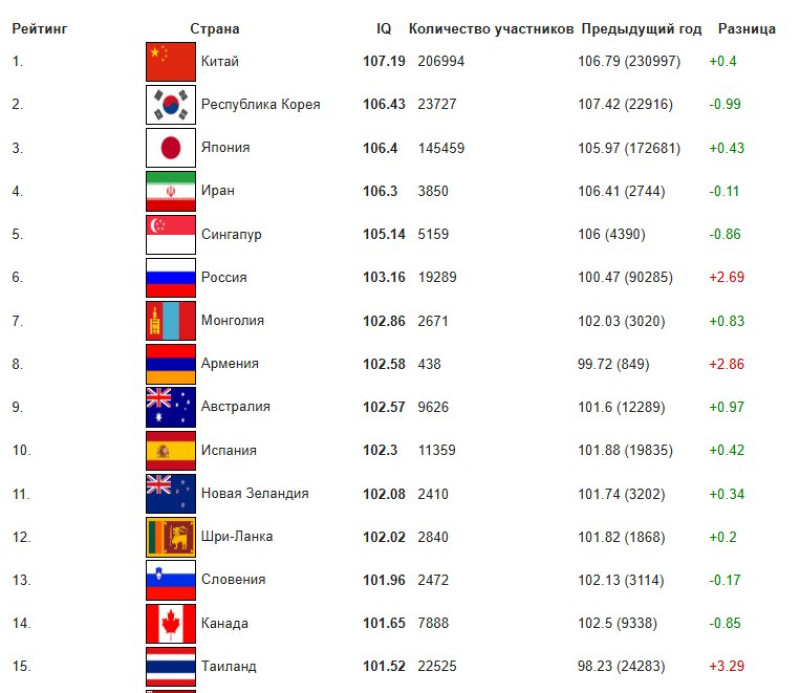 Первое место в рейтинге занимают жители Китая — их средний показатель составляет 107,19 балла; затем идут жители Южной Кореи — 106,43 балла и Японии — 106,4 балла.