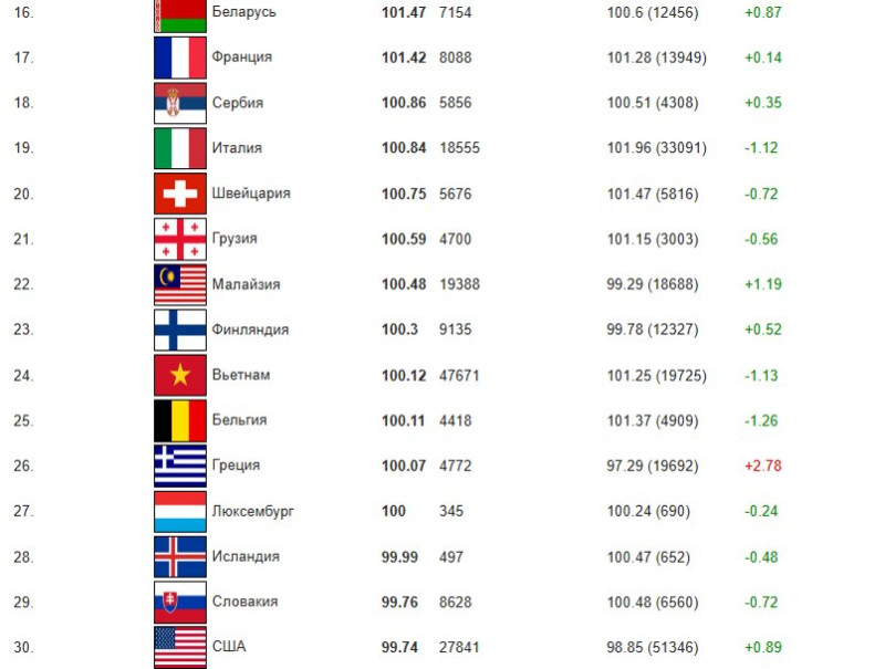 Россияне занимают шестую строчку рейтинга — 103,16 балла, за ними следуют жители Монголии (102,86 балла) и Армении (102,58 балла). Десятку лидеров замыкают австралийцы (102,57 балла) и испанцы (102,3 балла).