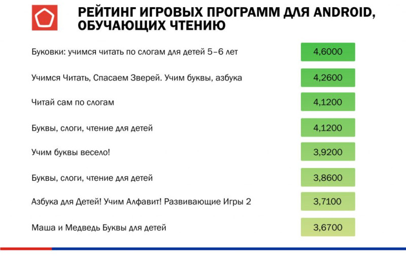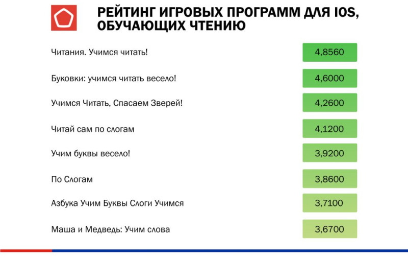 Лучшими образовательными играми, которые учат чтению, стали приложения «Читания. Учимся читать!» (4,86 балла) на платформе iOS и «Буковки: учимся читать по слогам для детей 5–6 лет» (4,6 балла) на платформе Android.