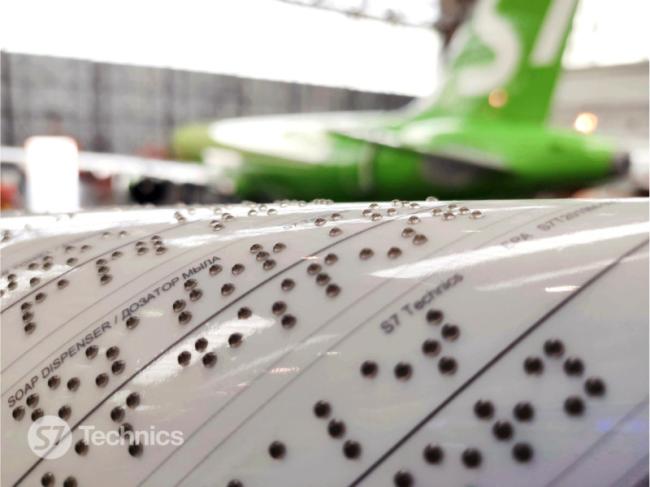 Компания S7 Technics первая в России выпустила комплекты наклеек со шрифтом Брайля, которые появятся в салонах самолетов российских авиакомпаний. Наклейки с тактильной маркировкой размещаются на борту для того, чтобы слепым и слабовидящим пассажирам было проще ориентироваться.