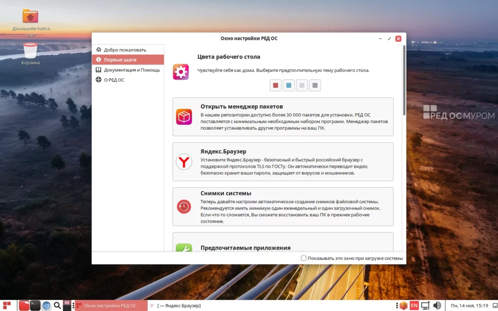 Окно настройки также знакомит пользователя с системой и позволяет выполнить первоначальную настройку. Здесь же можно установить Яндекс.Браузер — загрузка и установка в систему будут выполнены одним нажатием кнопки.