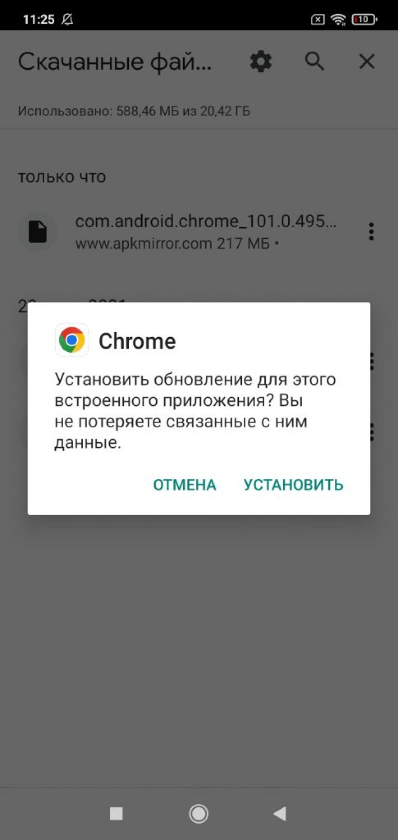 3. Нажмите на загруженный файл, и Chrome сам предложит установить обновление. Подтвердите действие.