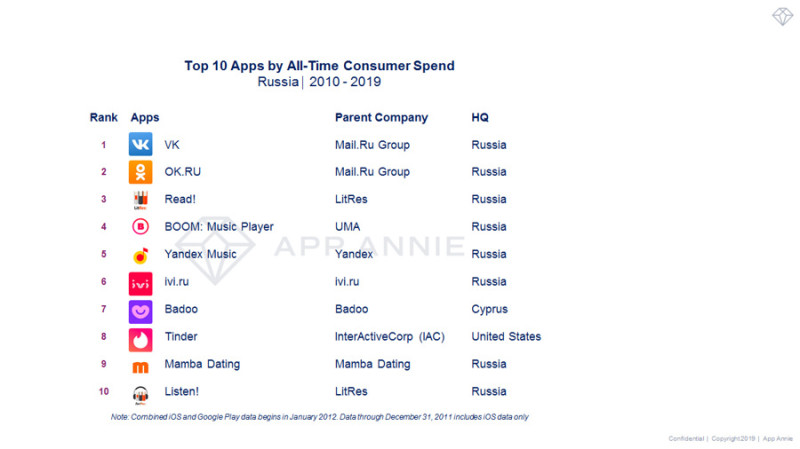 В рейтинге приложений за декаду по количеству потраченных в них россиянами средств лидируют социальные сети, стриминговые и дейтинговые сервисы. Первое место — у «ВКонтакте», второе — за «Одноклассниками». «Бронзу» взяла читалка Read! от магазина электронных книг «Литрес». За ними следуют два музыкальных сервиса: Boom — официальный музыкальный сервис для «ВКонтакте» — и «Яндекс.Музыка».