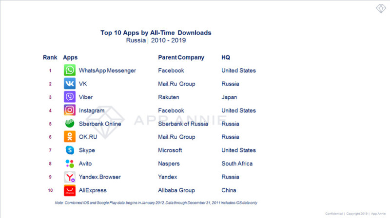 Лидером по числу загрузок в iOS и Google Play с 2010 по 2019-й стал мессенджер WhatsApp. «ВКонтакте» заняла второе место, Viber — третье. Замкнули пятерку Instagram и мобильный банкинг «Сбербанка».