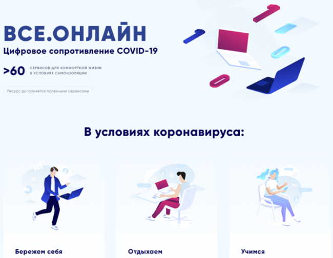 Министерство цифрового развития, связи и массовых коммуникаций Российской Федерации (Минкомсвязь России) объявило о запуске ресурса «Все.Онлайн» с информацией о полезных веб-сервисах для граждан, вынужденных находиться в режиме изоляции в связи с распространением коронавируса.