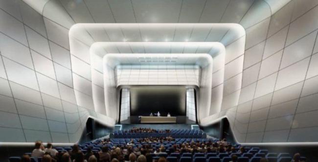 В этом супертехнологичном пространстве смогут расположиться лекционная зона с сиденьями-ступенями, подиум для модных показов, театр с оркестровой ямой или бальный зал с ровным полом. Вместе с оборудованием он занимает целых семь этажей.