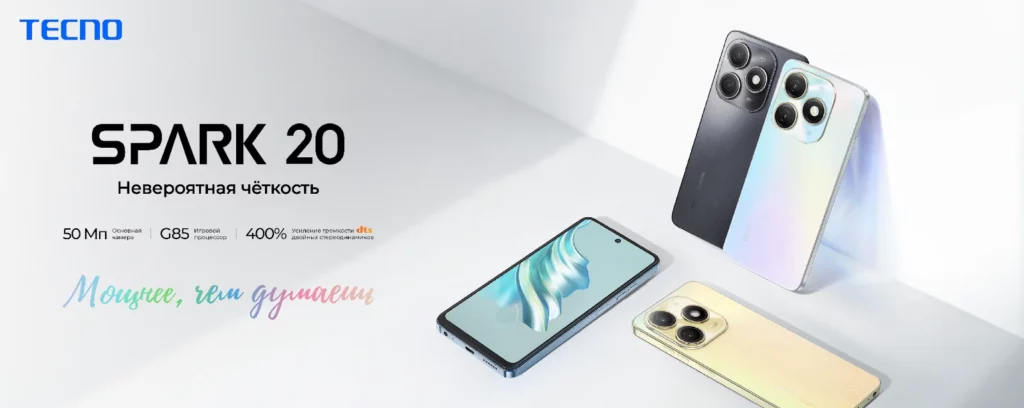 SPARK 20 отличается благодаря основной камере 50 МП, камерой селфи 32 МП, сочетанию 256 ГБ основной и 8 ГБ оперативной памяти, а также процессору MediaTek Helio G85.
