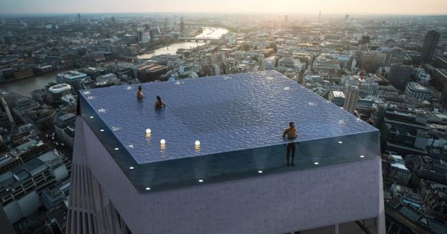 Бассейн построят на крыше 55-этажного отеля, его будут наполнять 600 тысячами литров воды. Его назвали бесконечным за панорамный вид на город — стенки и пол будут полностью прозрачными. Люди смогут видеть что происходит со всех сторон.