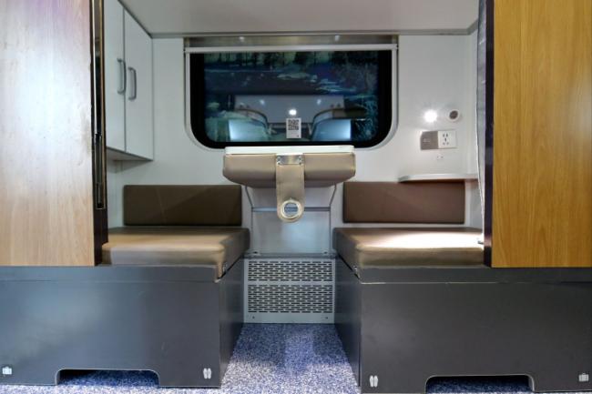 Ключевое отличие этого вагона заключается в том, что здесь установлен специальный модуль, который разделяет четыре места, при этом он используется предельно эффективно — в нем можно разместить багаж. Кроме того, есть места для хранения обуви.