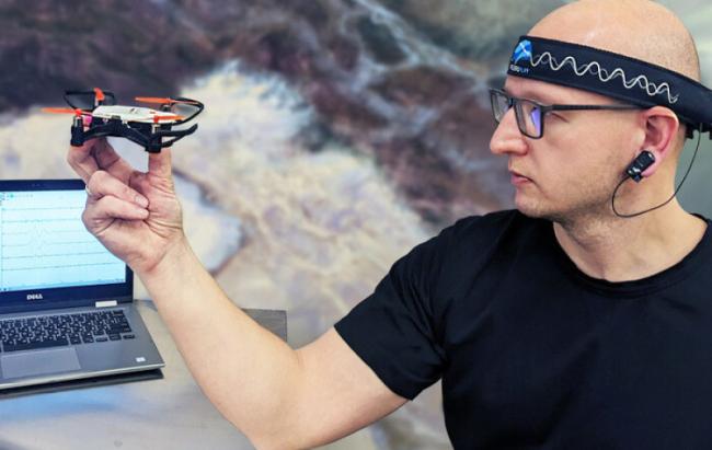 «Разработчики компании «Нейроботикс» связали дрон «Пионер мини» компании «Геоскан» с нейроинтерфейсом NeuroPlay, который позволяет пилотам управлять квадрокоптером с помощью мозговых импульсов, то есть силой мысли», — сказано в сообщении.