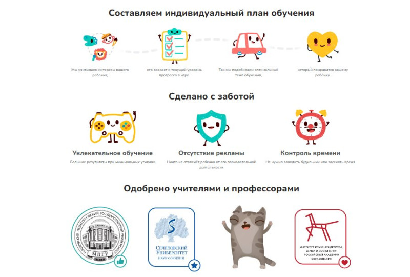 За успешное прохождение заданий ребенок получает награды — возможность посмотреть в приложении мультфильмы «Три кота», «Лекс и Плу: Космические таксисты» и «Развлечеба».