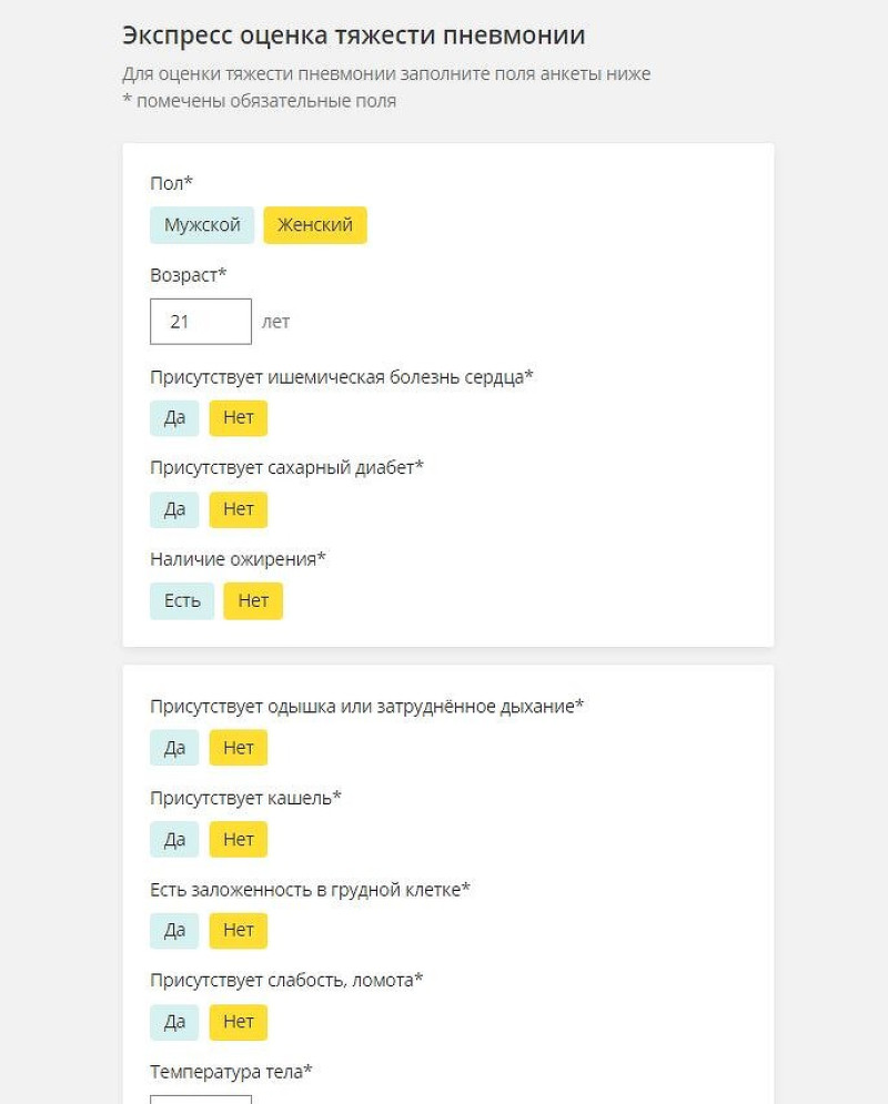 Проект получил название «КТ-калькулятор», и его интерфейс действительно напоминает калькулятор, только со значительно большим количеством полей ввода. Для получения результата нужно указать пол, возраст пациента, ответить на вопросы об имеющихся симптомах и привести результаты анализа крови.