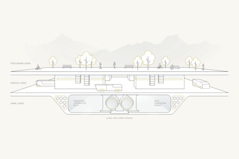 Причем есть даже некоторый выбор транспорта: либо поезд или некий вариант Hyperloop, либо шоссе для беспилотных автомобилей. Вся инфраструктура города спрятана под землей и формирует своеобразный «хребет».