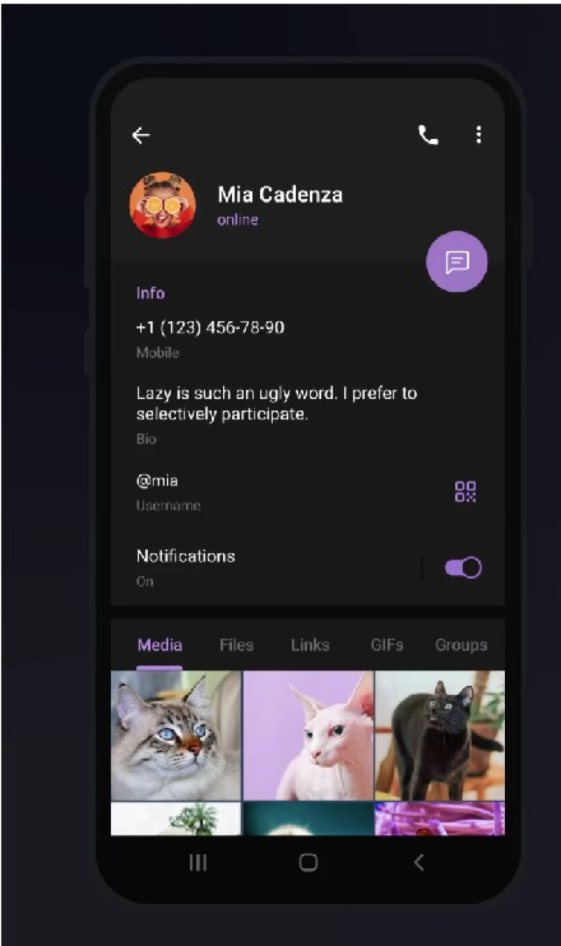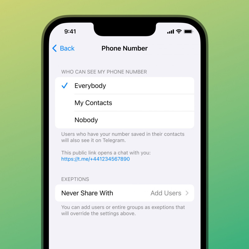 Также можно поделиться с друзьями прямой ссылкой на свой номер телефона, которая сразу откроет чат в Telegram, если вход по номеру телефона разрешен в настройках конфиденциальности.