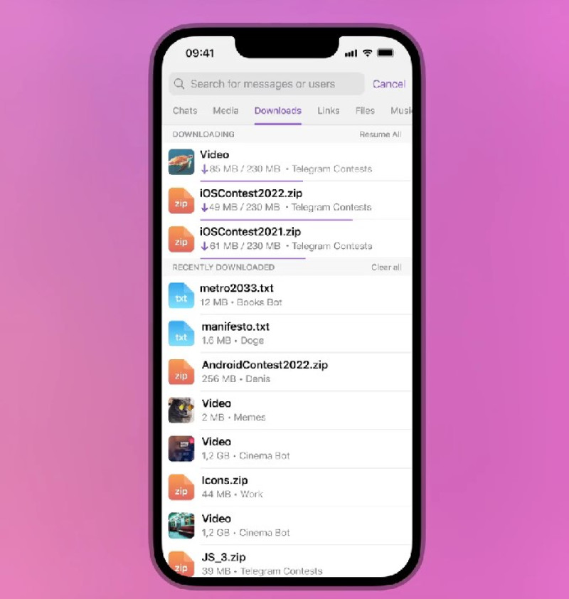 Там можно поставить на паузу и перезапустить загрузки, а также повысить приоритет для скачивания того или иного файла, либо перейти к чату, в котором он был отправлен.
