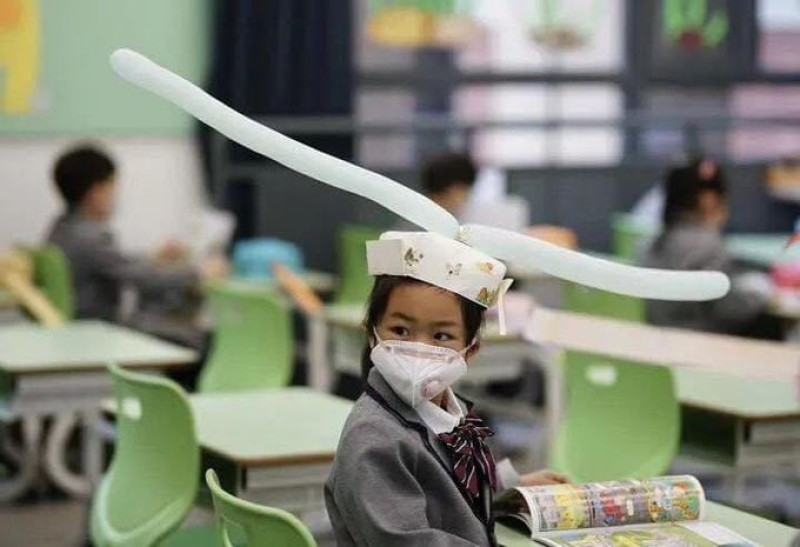 Китайские школьники вернулись на занятия, поддерживая социальную дистанцию с помощью хитрой идеи. Чтобы дети не забывали про то, что им нельзя подходить друг к другу, их обязали носить самодельные шляпы.