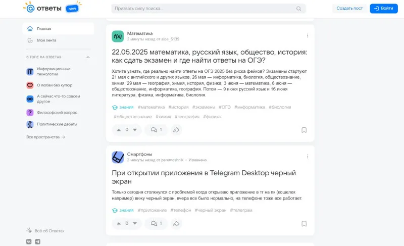 Пользователи могут создавать посты трех типов: «Мнение» (для обсуждений и личных точек зрения), «Знания» (для точных и проверенных ответов) и «Истории» (для публикации больших текстов с личными впечатлениями).