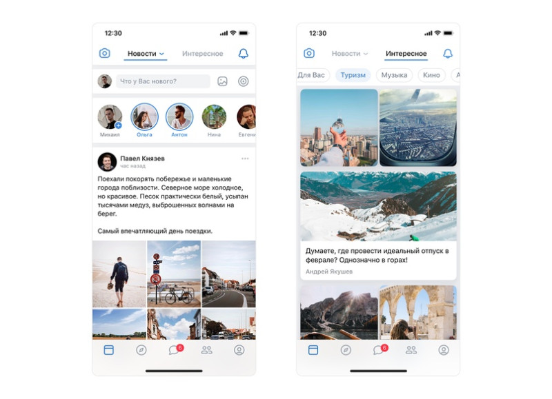 Здесь собраны истории и записи от друзей, а также публикации сообществ. Достаточно смахнуть влево, чтобы перейти в раздел «Интересное». В нём — рекомендованные материалы. Во вкладке «Для Вас» — посты, подобранные по интересам пользователя.