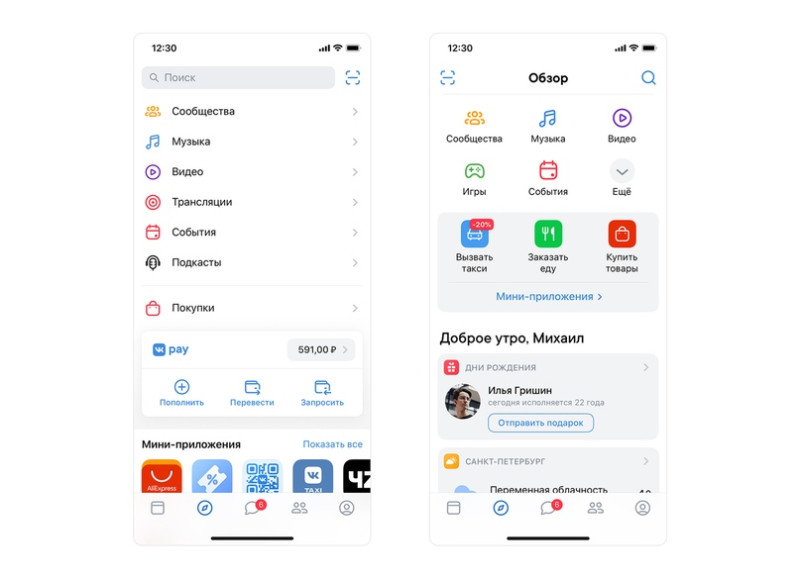 Изменились дизайн и навигация: в первой вкладке объединились ленты новостей и рекомендаций, во второй — мини-приложения, VK Pay, сообщества и стриминговые сервисы. Далее расположились вкладки для общения и поиска друзей, а также профиль — для публикации новых материалов.