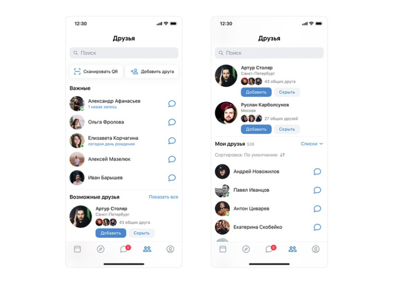 Этот раздел находится рядом с «Сообщениями». В нём можно принимать новые заявки, искать друзей и добавлять их по QR-коду. Во вкладке также отобразится, если у кого-то из знакомых сегодня день рождения — отправить подарок этому человеку можно будет одним касанием.