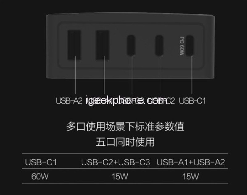 Данное зарядное устройство оснащено пятью разъемами (2 USB-A, 2 USB-C