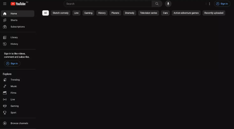 Если вы отключили историю просмотров на YouTube и у вас нет значительной предыдущей истории просмотров, вы не увидите рекомендованный контент. Это означает, что на главной странице будут видны только строка поиска, а также кнопки «Shorts», «Подписки» и «Библиотека».