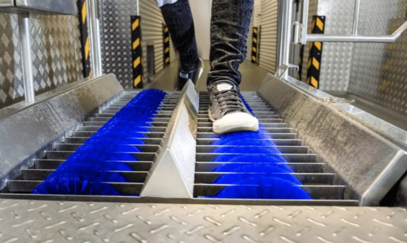 По всему заводу установлены санитарные станции. У нас они автоматические и работают по принципу турникетов в метро: например, если вот эта штука на фото ниже не помоет сотруднику обувь и не обработает руки дезинфицирующим раствором, система просто не даст ему пройти в следующий отсек.