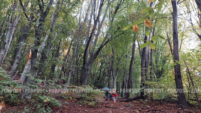 Отдохнув и подкрепившись свежей ледяной водой, продолжаем подъём — осталось преодолеть чуть более километра. Тропа теперь петляет по сосново-буковому лесу. Длинные корявые ветви деревьев будоражат фантазии путников, а крутой склон вынуждает снизить темп движения.