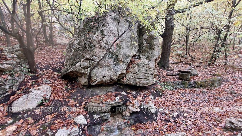 Километр спустя приближаемся к роднику с поэтичным названием Разбитое Сердце (44°50'25"N 34°21'42"E). Нависающая над источником пресной воды скала расколота на две части, — видимо, её обломки вызвали печальные ассоциации у авторов топонима.