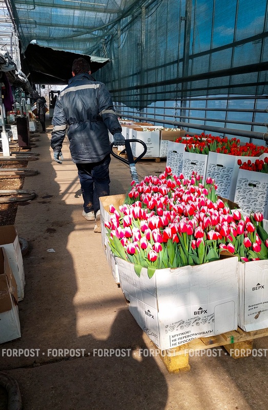 Заполненные контейнеры девушки передают товарищам, чтобы те отвезли ценный груз в холодильник овощехранилища «Крымтеплицы», на чьей территории работает цветочный агрохолдинг. Там тюльпаны будут дожидаться отправки оптовым закупщикам.