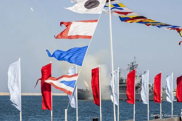 Итак, праздник начинается в 08.45 Торжественным подъёмом Государственного и Военно-морского флагов, флагов расцвечивания на кораблях и судах Черноморского флота – (Севастопольская бухта)