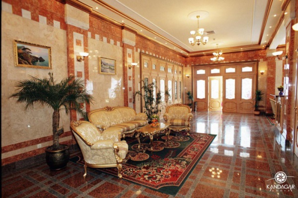 Гостиница внешне вполне соответствует легенде. Сплошной мрамор… Своя парковая зона с беседками и скульптурами в античном стиле. Между тем, при всей пафосности, нет своего паркинга и то, что гордо именуется гостиничным пляжем, трудно назвать таковым даже по советским меркам.