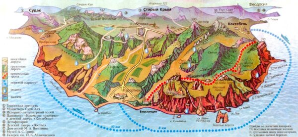Закончить посещение можно спустившись по лесной дороге в пос. Коктебель, или вернувшись по горно-лесной тропе в пос. Курортное.