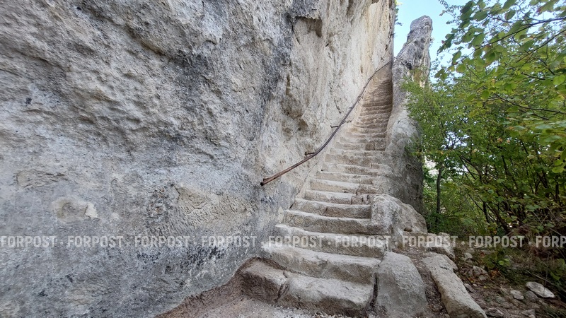 Через полчаса добираемся до первого поворота направо (44°44′33.1″N 33°54′34.5″E), именно он нам и нужен. Смело сворачиваем, и через сотню метров приближаемся к головокружительному краю скального обрыва. Кажется, что дальше дороги нет и надо поворачивать обратно. Однако не спешите, а лучше присмотритесь внимательнее к местности: с плато прорублены ступени вниз, прямо на территорию Свято-Успенского монастыря.