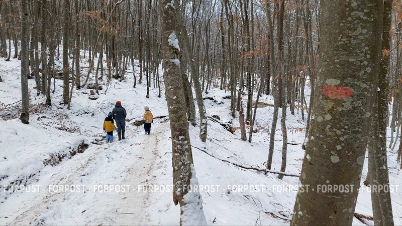 Дальше маршрут уходит в сторону от реки. Грунтовые дороги на этом склоне ущелья несколько раз расходятся, но заблудиться здесь сложно: все пути в итоге соединяются. Для удобства ориентирования кое-где маршрут отмечен красной полосой, которая нанесена на стволы деревьев.