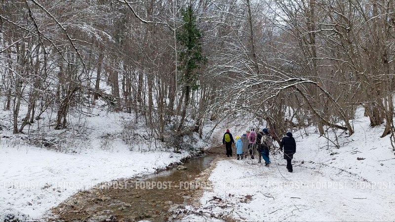 В самом начале водный поток необходимо перейти вброд. Никакого моста здесь не предусмотрено, поскольку в сухое время года воды в русле практически нет. Сейчас надо ступать осторожно: многие камни покрыты прозрачным льдом, и на них можно поскользнуться.