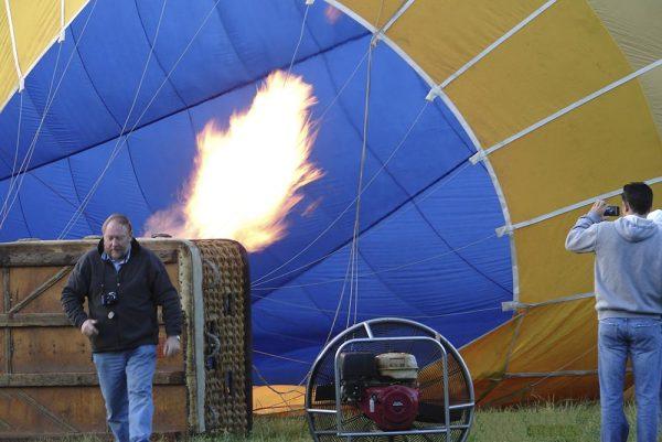 План был составлен, и всем предложили поучаствовать в подготовке воздушного шара к полету. Его раскладывают на земле так, чтобы стропы не перепутались, и специальный агрегат наполняет его горячим газом. И метры безжизненного материала, невзрачно лежащего на земле, начинают оживать, словно некий великан вдыхает в него жизнь. Подготовка длится около получаса.