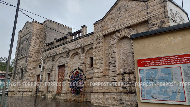 Пройдя сквозь арку ворот, попадаем на пешеходную Караимскую улицу. Справа остаются ворота городского хлебозавода, а слева взгляд привлекает здание бывшей Купеческой синагоги (45.198194, 33.379024). Культовое сооружение было построено в 1912 году на средства местных предпринимателей по проекту архитектора Адама Генриха.