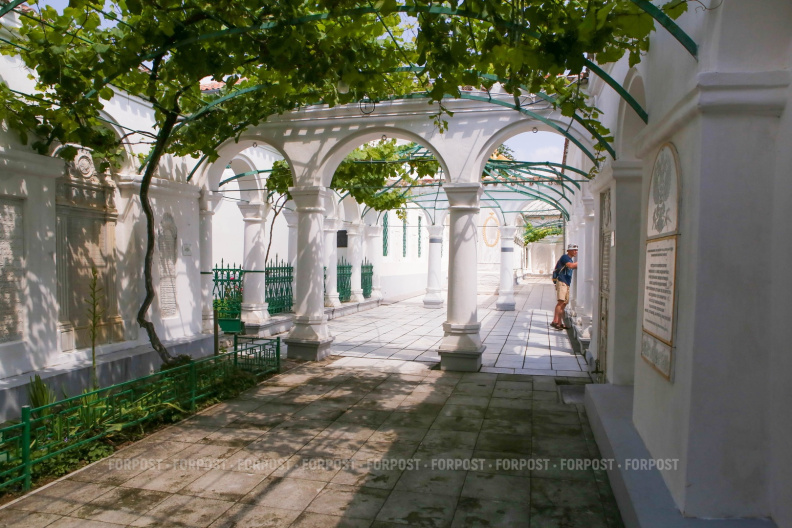 Завершаем прогулку в православном соборе Николая Чудотворца (45.196620, 33.378991), соседствующем с мечетью. Белоснежный храм с ярко-голубыми куполами был построен в память об освобождении Евпатории от англо-французско-турецких войск в Крымской войне.