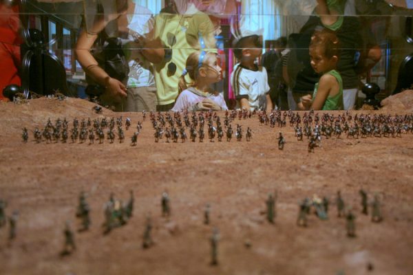 На переднем плане размещены инсталляции обстановки поля сражения, которые незаметно переходят в перспективу картины. Таким образом воспринимаемое кажется вполне реальным, трехмерным.